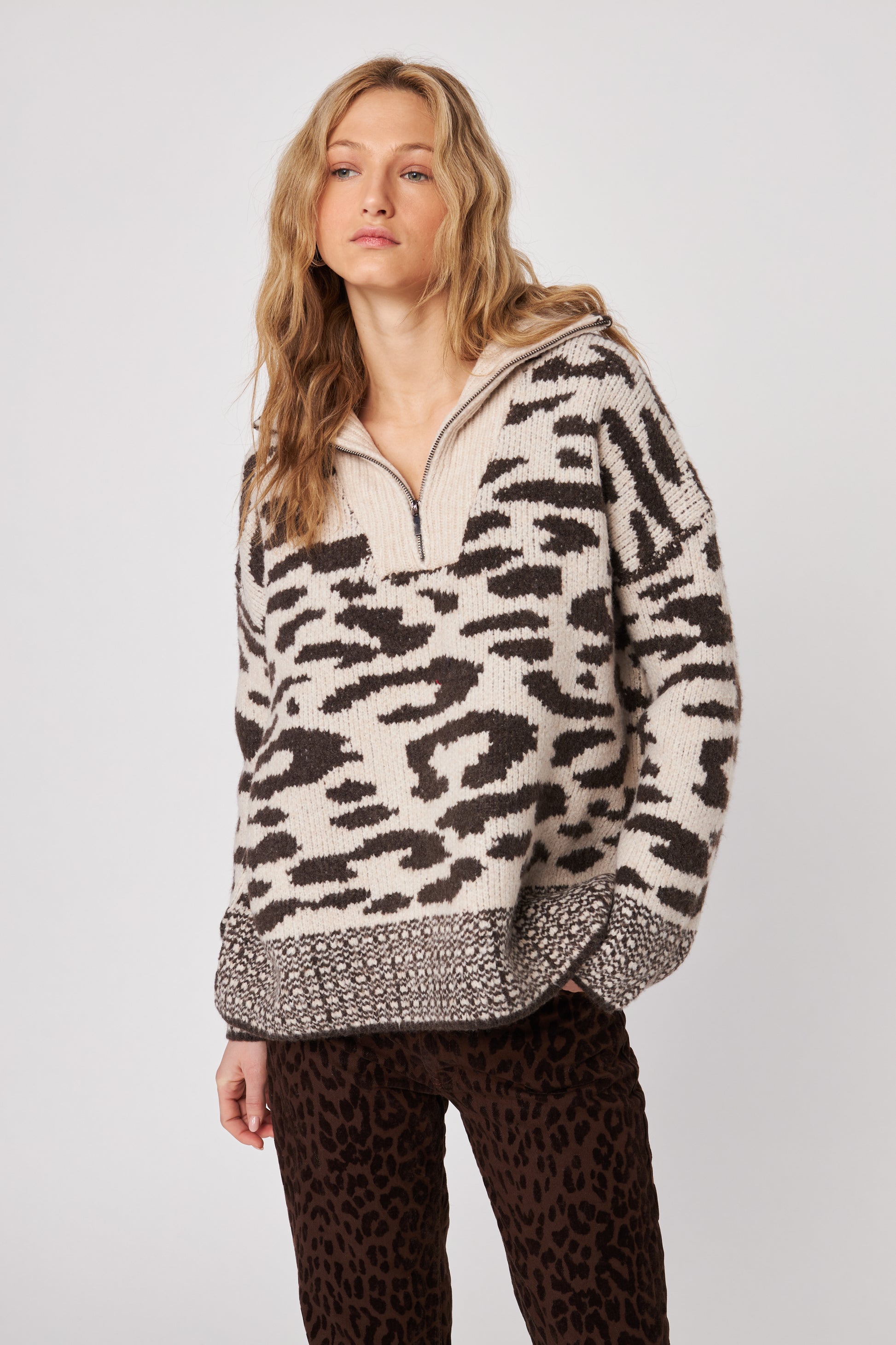 Stay effortlessly chic in this velvety soft Animal Print pullover. Featuring a funnel neck with a 3/4 zip for easy layering, wide cuffs, and a loose fit moves with you while keeping comfort front and center. The standout contrast patterned wide hem adds a playful twist to your casual look—perfect for lounging or stylish adventures!