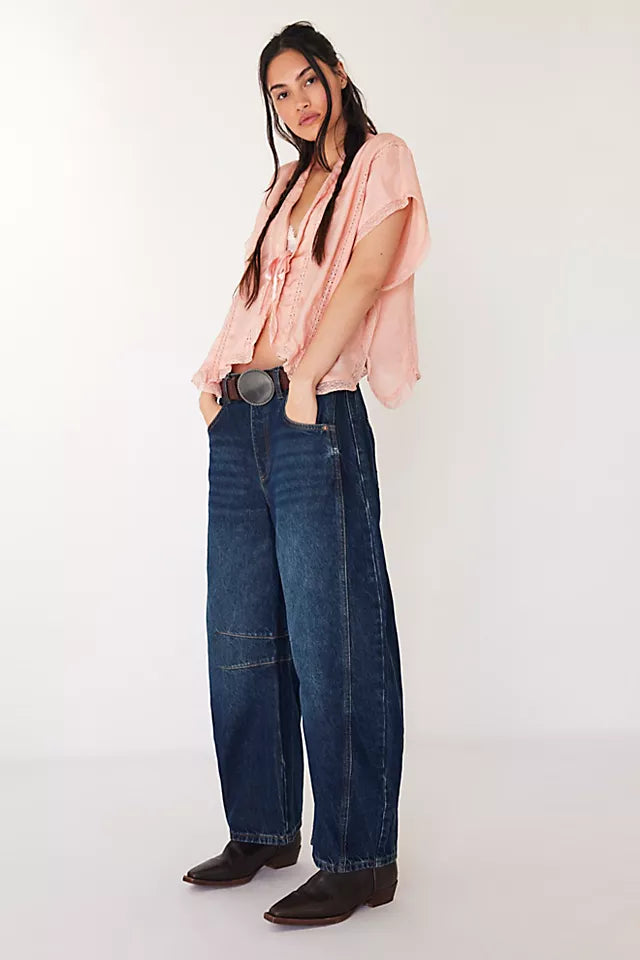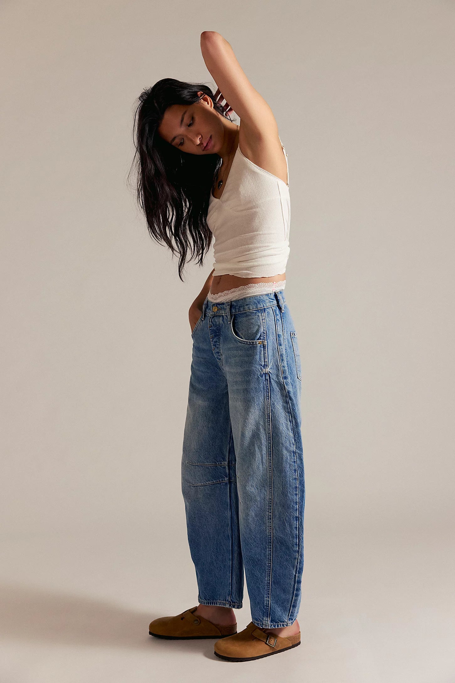 These Good Luck Mid Rise Barrel jeans are the perfect addition to your wardrobe. Made by a team known for setting trends, these jeans offer a flattering mid-rise fit and unique barrel shape. Stay on-trend with these must-have jeans.
