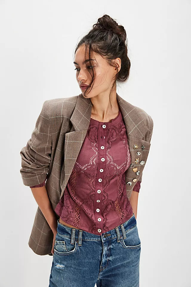 Add a dainty touch to your look with this sheer cotton-lace long sleeve, featured in a button-front style for a versatile piece that’s perfect for layering.
