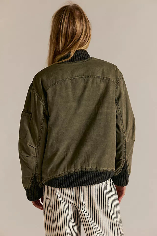 Effortlessly cool in every way, this classic bomber jacket from We The Free is featured in a washed fabrication with knit ribbed trims for a cozy touch.