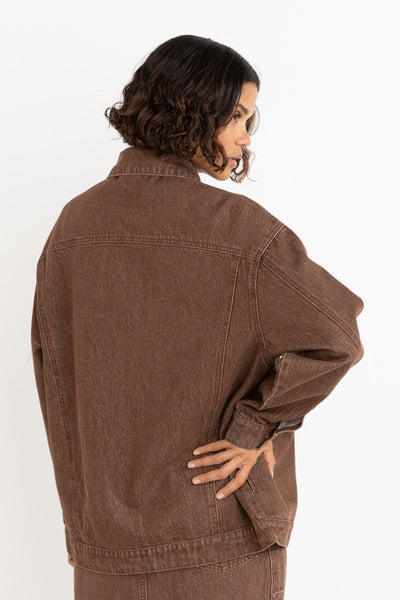 The Oversized Denim Jacket in Dark Brown embodies effortless style with its dropped shoulders, flap chest pockets, and shank button closures. The yoke detailing and below-the-hips length offer a relaxed fit with a hint of structure.