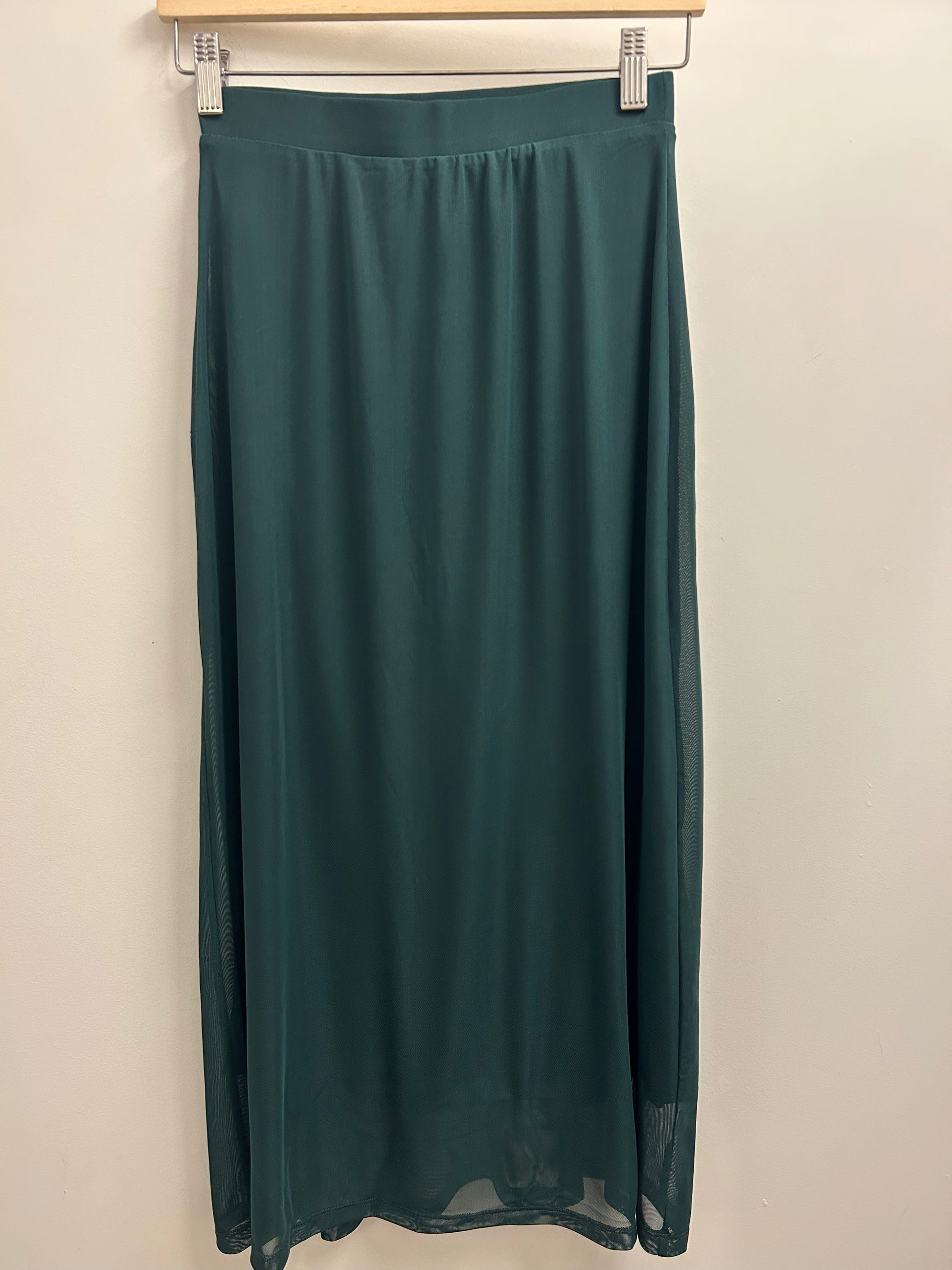 The Sandra Midi Skirt features a graceful mesh overlay that creates elegant movement, paired with a solid underslip for comfortable coverage. Its rich forest green hue adds depth and sophistication, making it a versatile piece that effortlessly transitions from day to evening wear. Designed for an easy, flattering flow, this skirt brings expert craftsmanship to your wardrobe essentials.