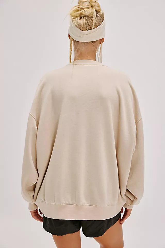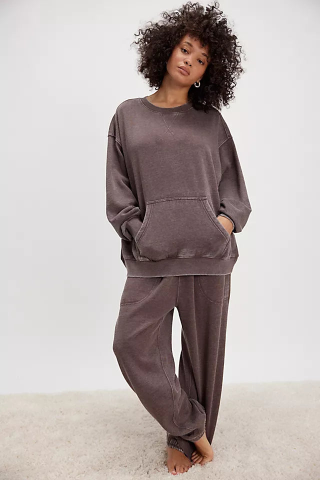 Fit: Oversized, relaxed Features: Comfy cotton blend, drop-shoulder long sleeves, crew neckline, kangaroo pocket. Perfect for days off, running errands, and everything in between.