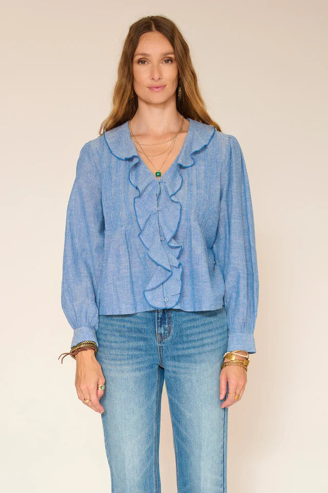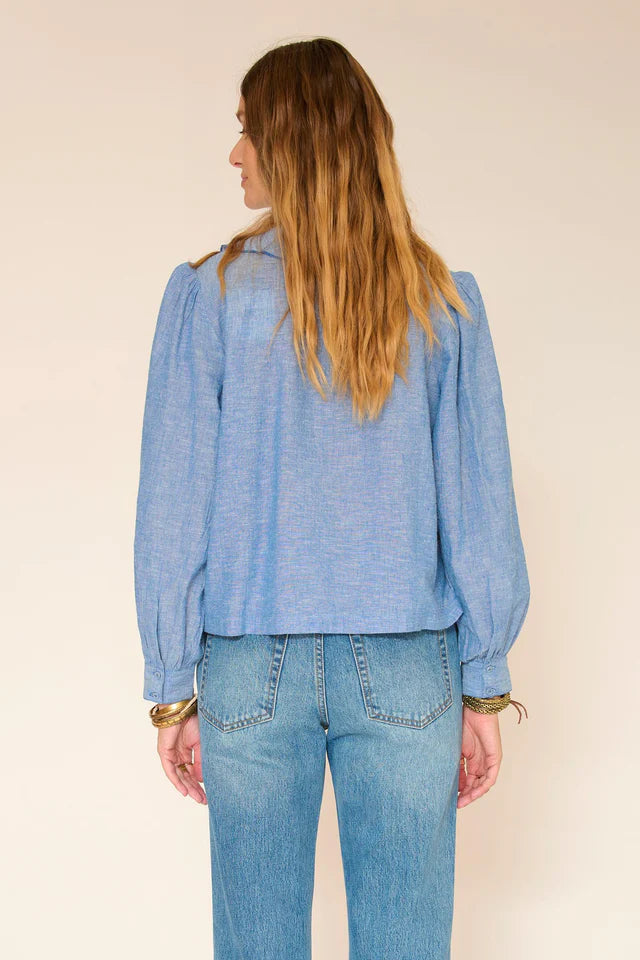 A fresh and luminous blouse, available in soft blue , immediately sets the tone. The cut is fluid, with lovely volume in the sleeves and a natural drape that moves with you. The ruffle at the front adds a feminine and fashionable touch without weighing down the silhouette.